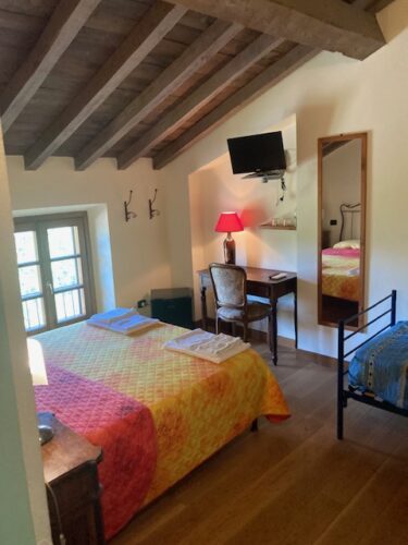 La camera Il Ciliegio consta di un letto matrimoniale ed un lettino, ed è adatta a coppie con bambino.